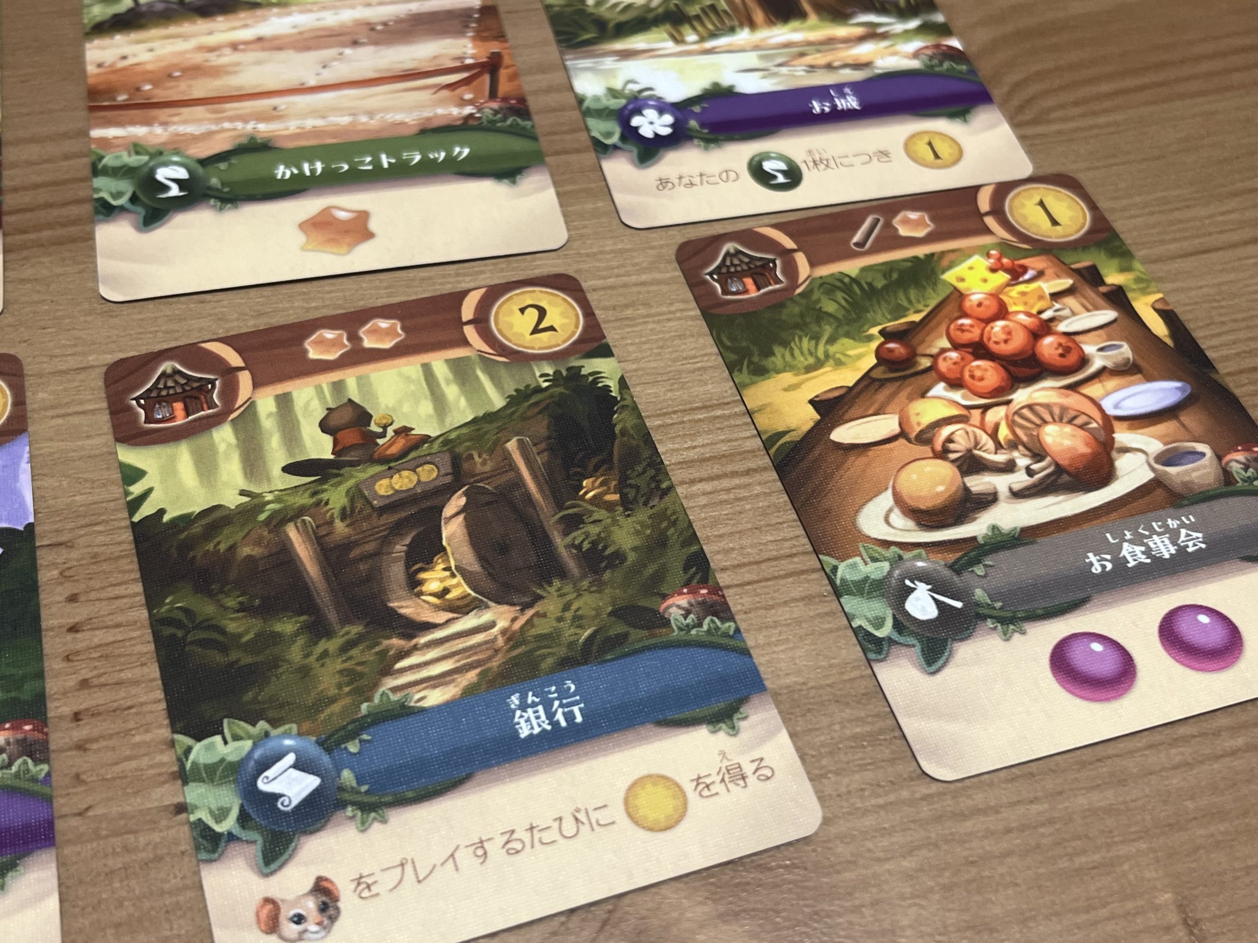 カードの効果は、定期収入や永続効果、即時効果、ゲーム終了時効果などさまざま。