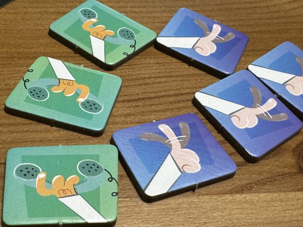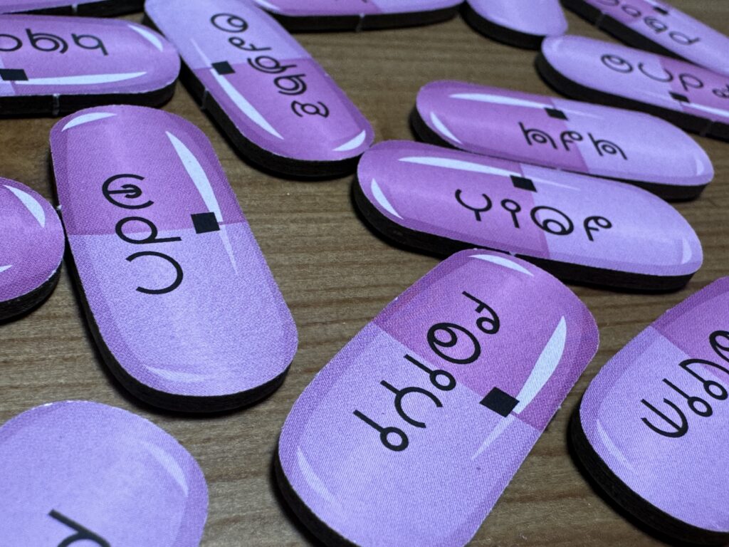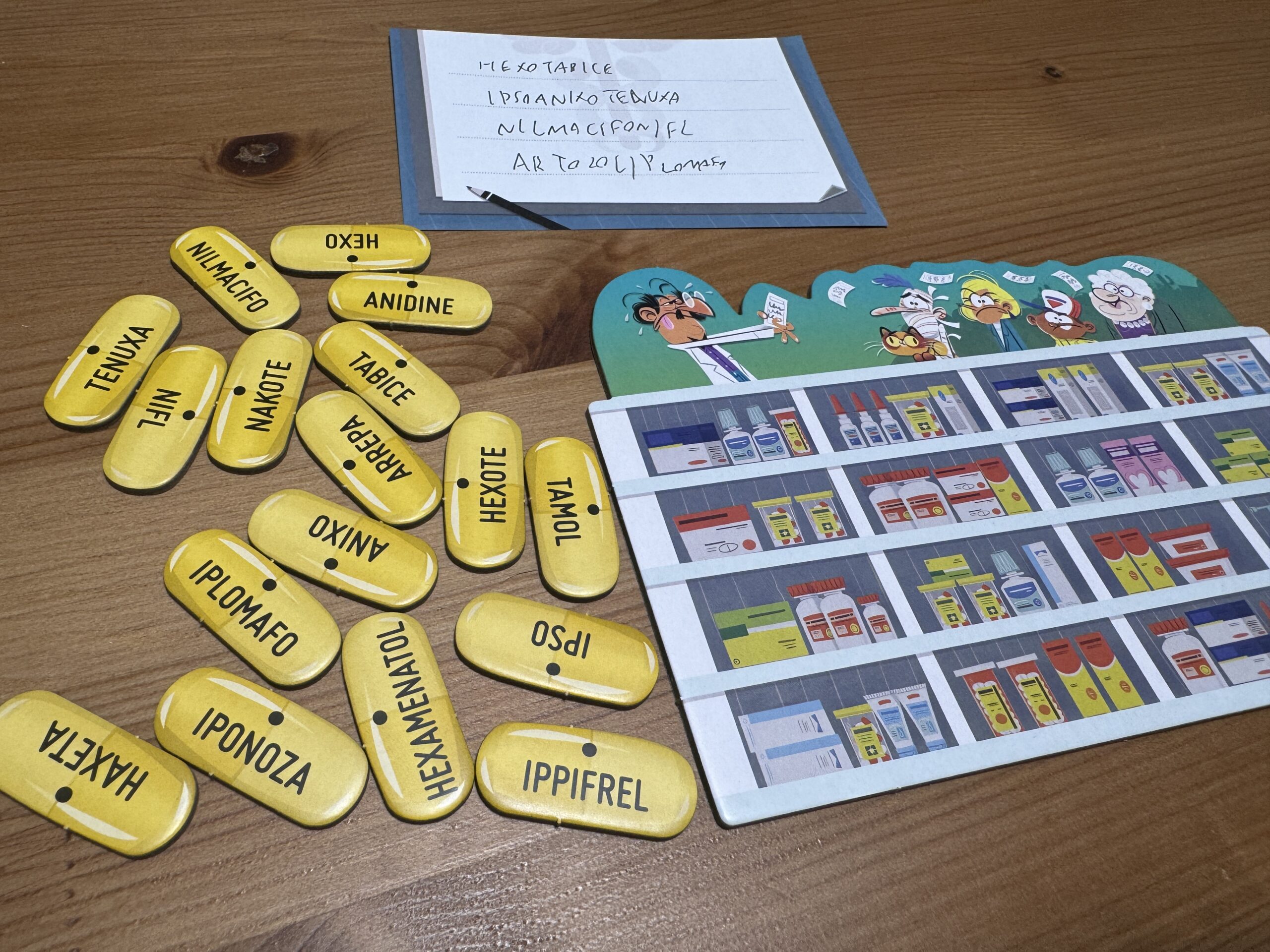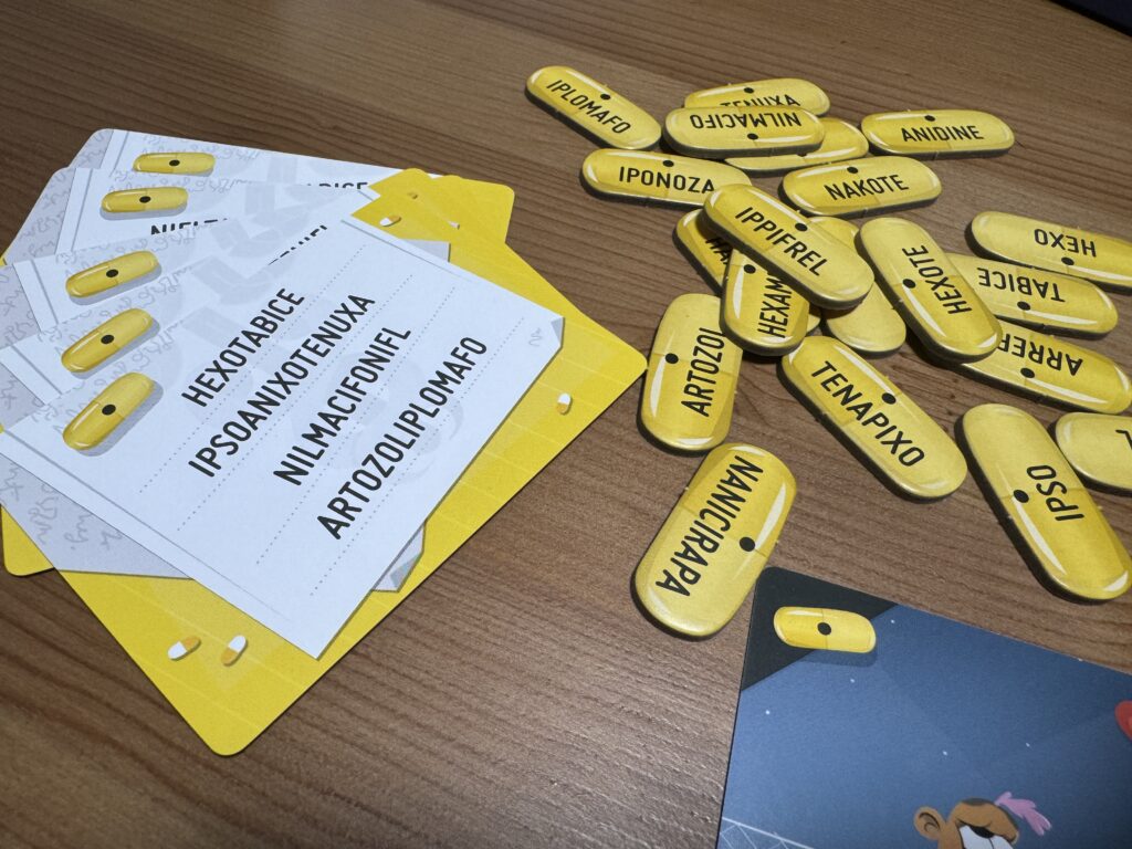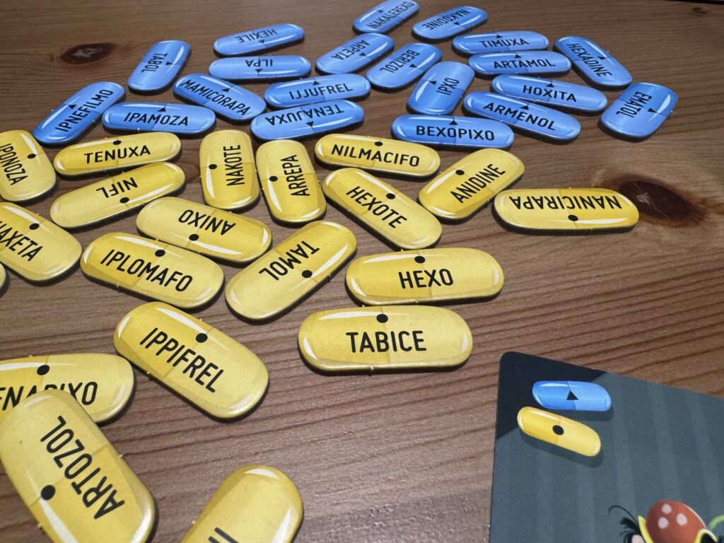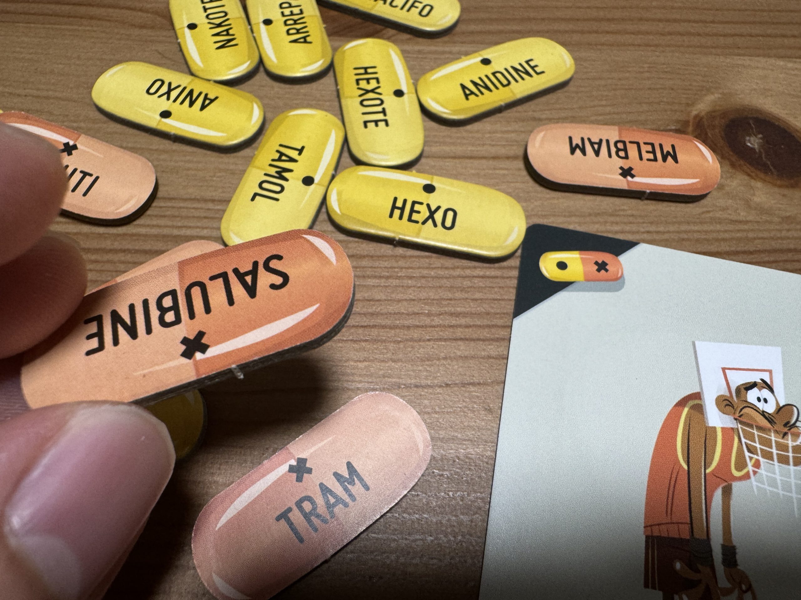 錠剤トークンをボード上に並べることで、4つの薬名を再現するんだね!