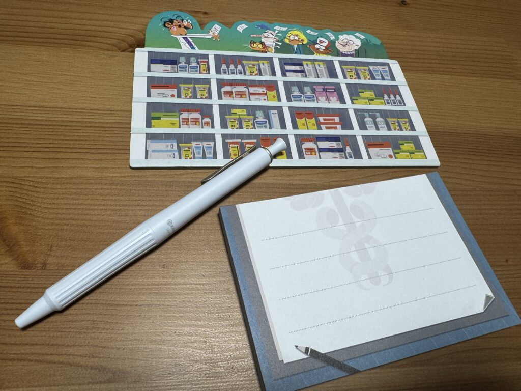 薬剤棚を模したボードと、処方箋代わりのメモ用紙、そしてペン(内容物には含まれません)を1本用意したら、いよいよゲームスタートだ!