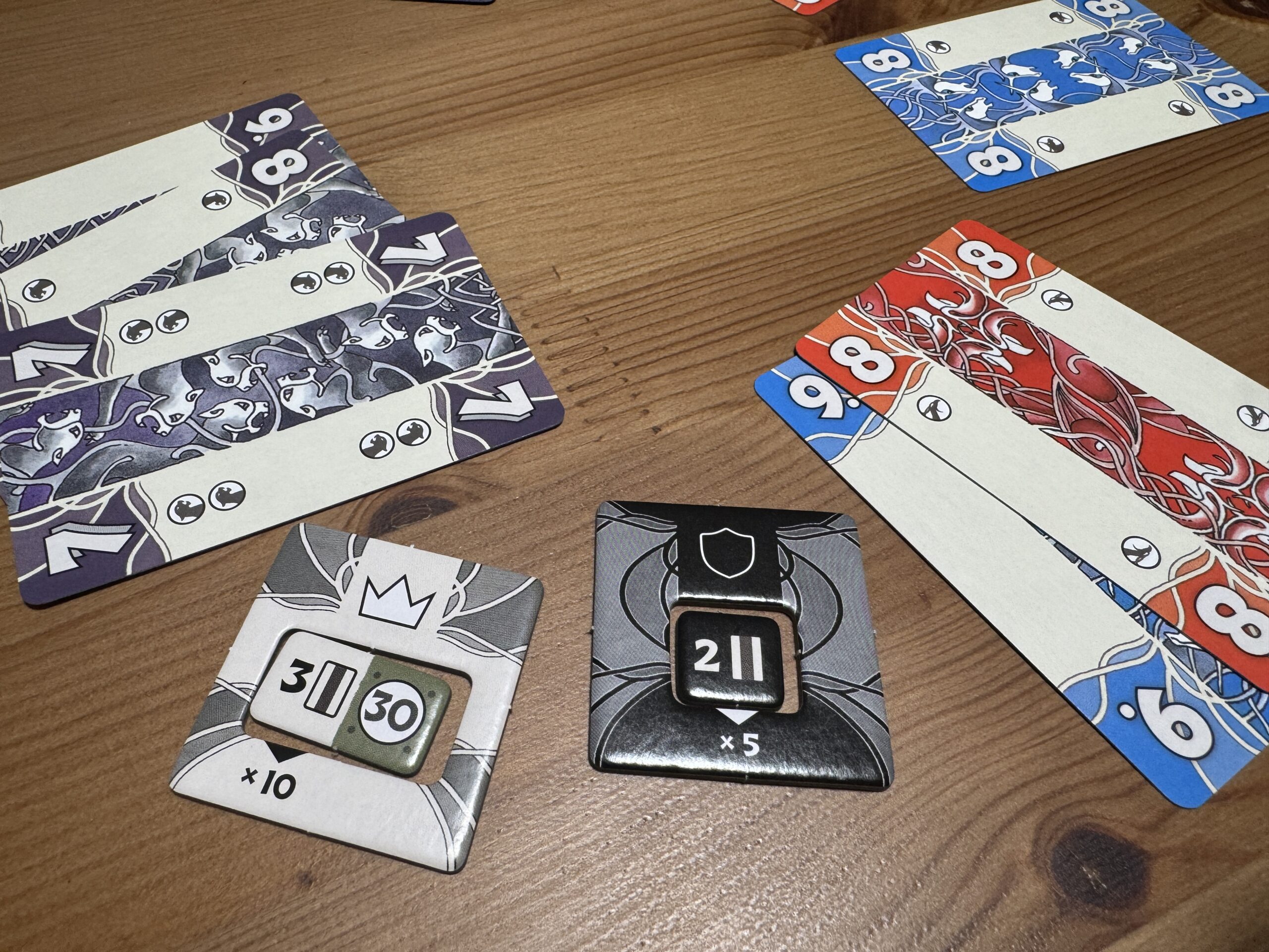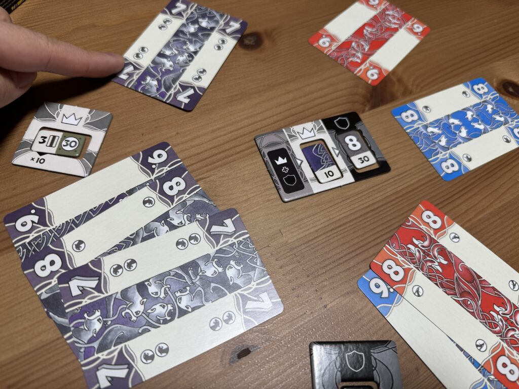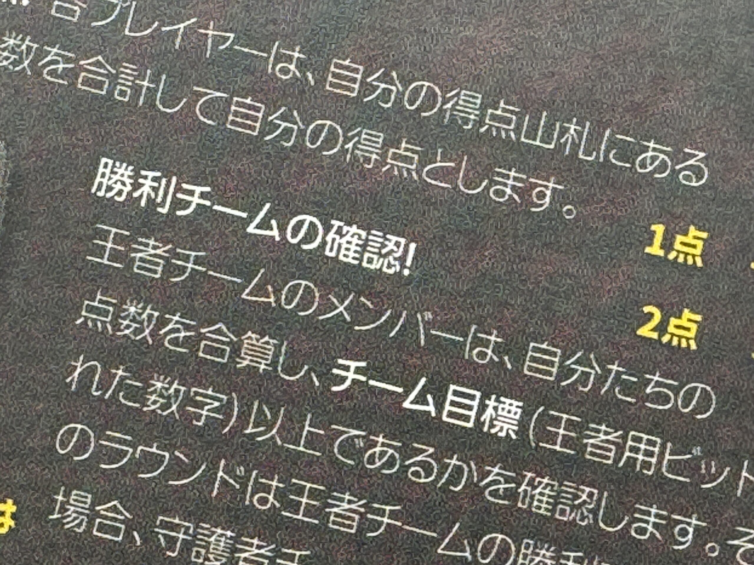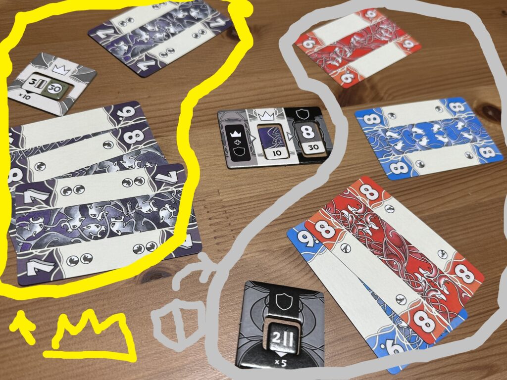 で、勝利チームはボーナス点を得るわけですが、これもまた、チームのリーダー(王者か守護者)が競りで公開したカード枚数に依存するんすよ!