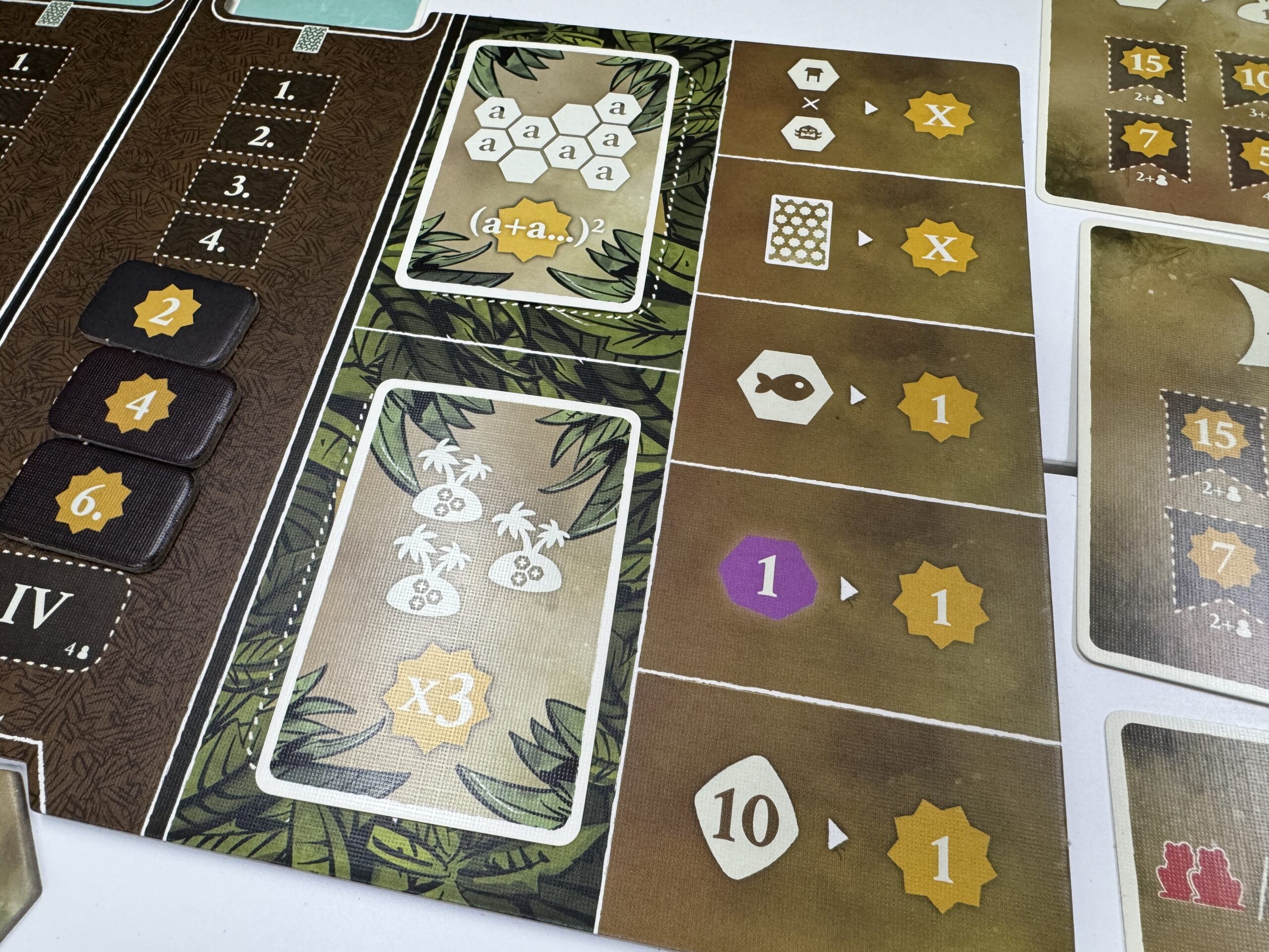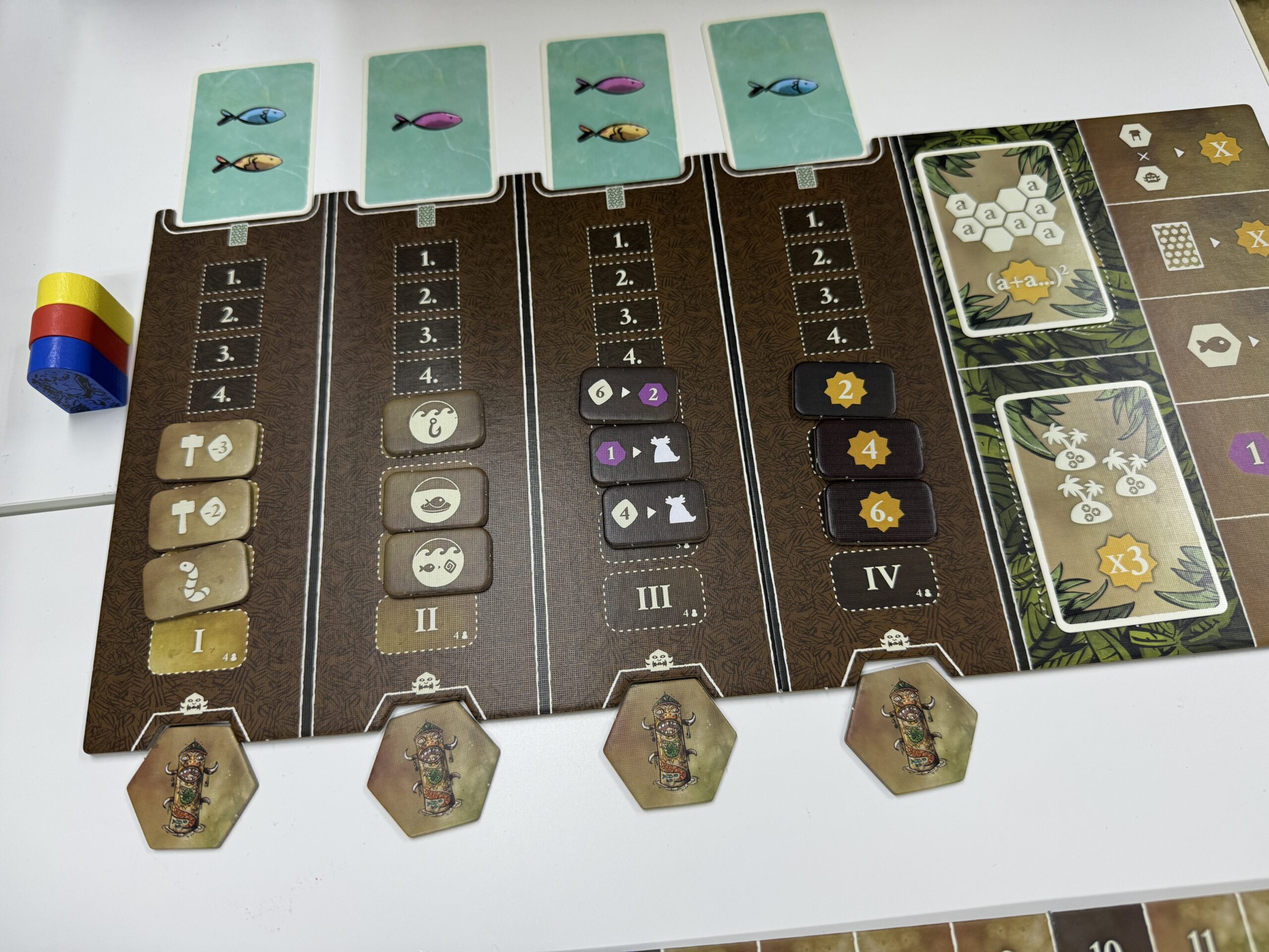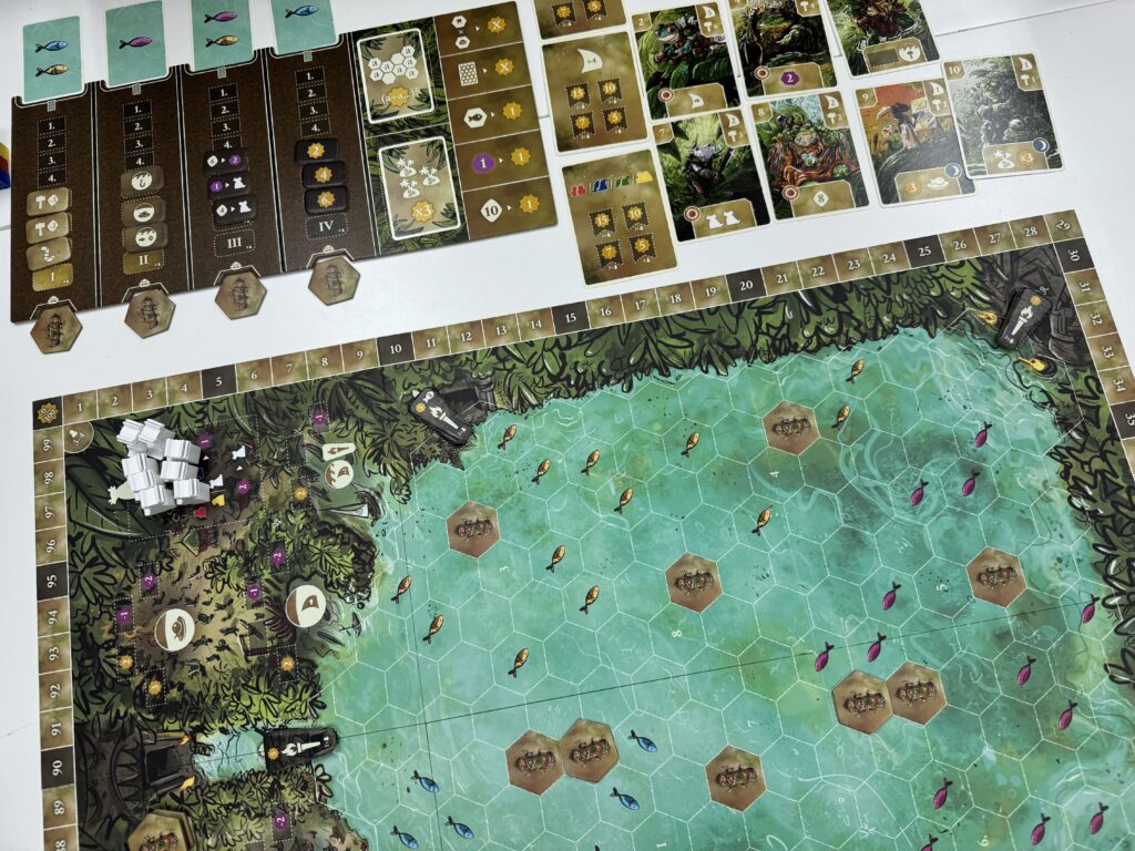 氏族ボードから開拓地タイルを取り除くことで、毎ラウンドの収入が増えたり、釣りの際の漁獲量が増えたり、労働者や船の個数が増えたりします。どこから伸ばすか悩む~~!