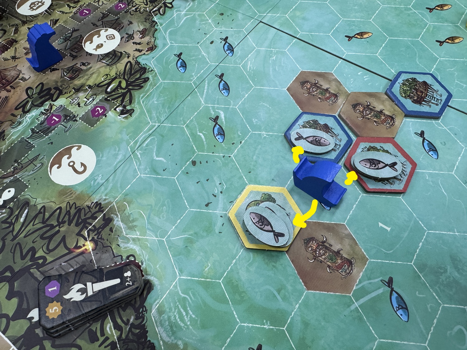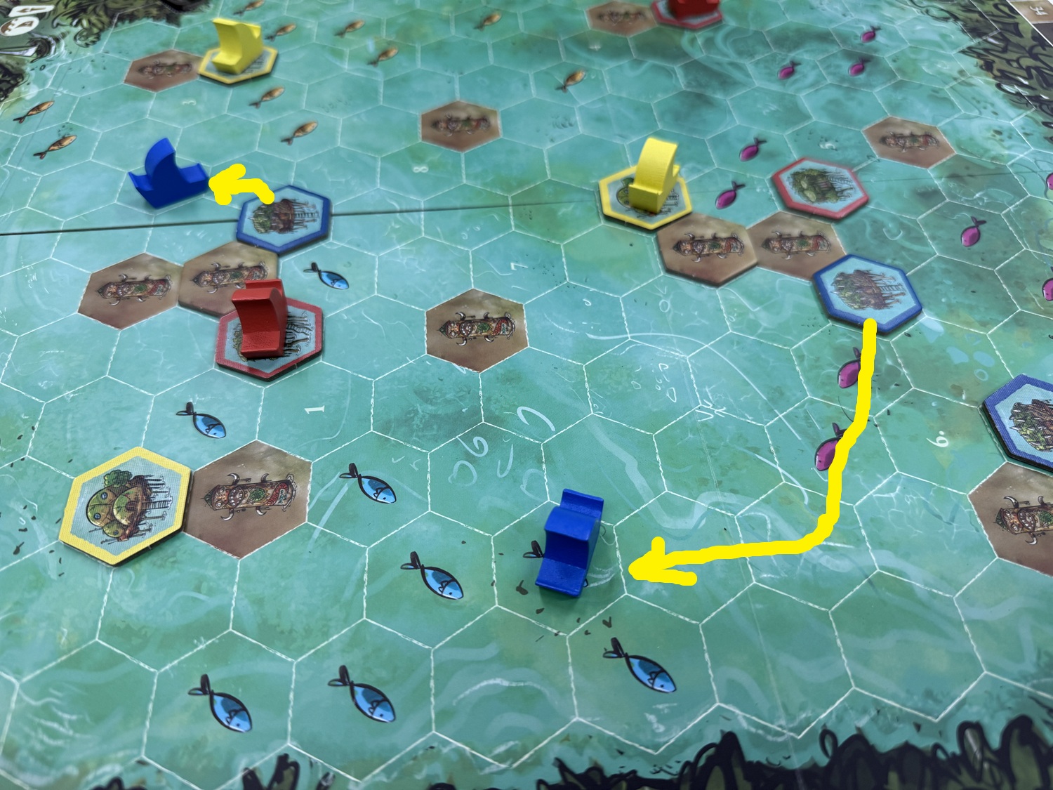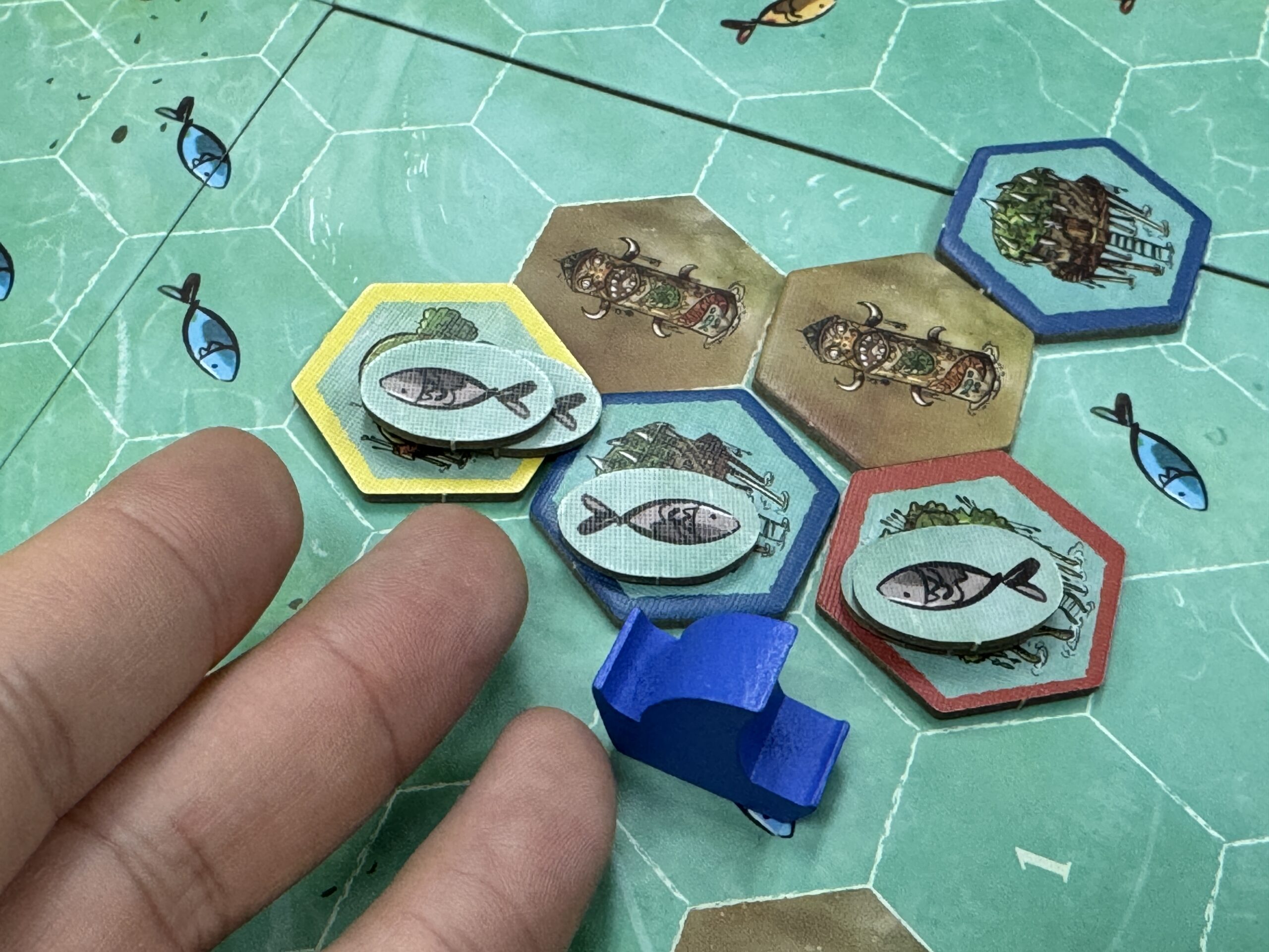 今回の手番で魚を置いちゃうと、ちょっと次の人が祝祭強すぎるか……とかね!