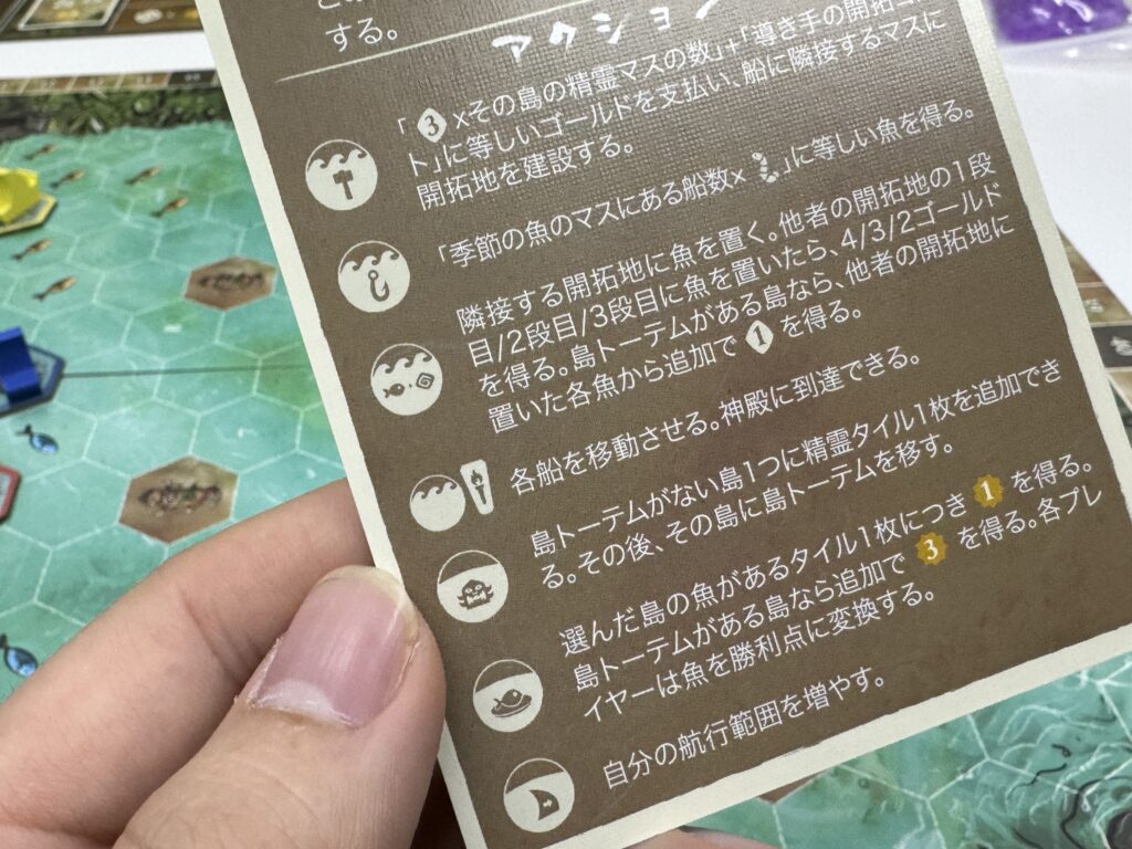 船を「季節の魚」が示されたアイコン上へと動かすことで、魚トークンをゲットできます。
